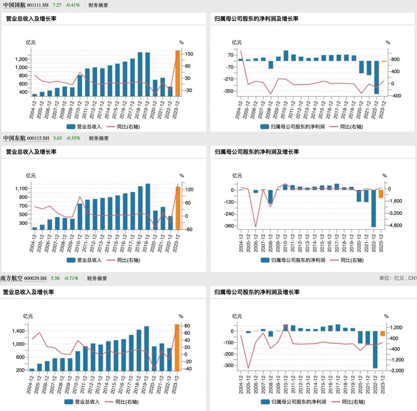 截至3月28日晚間,中國國航(601111.SH)、中國東航(600115.SH)、南方航空(600029.SH)陸續(xù)披露完2023年年報。三大航空央企2023年營業(yè)收入總計為4147.7億元,同比增長超1.2倍;歸母凈虧損總計134.23億元,同比收窄近九成。