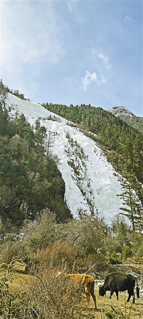 尼屋分為上尼屋和下尼屋。沿著尼屋藏布一路向上幾十公里,就來到上尼屋,夾岸兩山草木茂盛、松柏蒼翠、牛馬成群。但最讓人驚喜的是依嘎瀑布和依嘎冰川,依嘎瀑布飛瀉直下,流入尼屋藏布,依嘎冰川遠(yuǎn)看如婚紗裙擺飄灑山間,近看是明顯的冰川融化形成山體斷面。