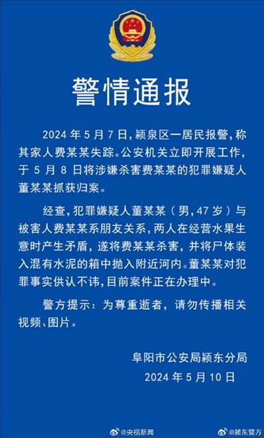 ·安徽警方通報(bào)“水泥封尸”事件:男子因生意矛盾殺害朋友裝水泥箱中拋尸。
