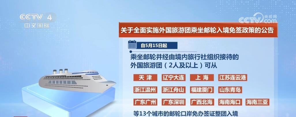 央視網(wǎng)消息:中國國家移民管理局發(fā)布公告,為進(jìn)一步促進(jìn)便利外籍人員來華旅游,自5月15日起,在中國沿海省份全面實(shí)施外國旅游團(tuán)乘坐郵輪入境免簽政策,乘坐郵輪來華并經(jīng)由境內(nèi)旅行社組織接待的外國旅游團(tuán)可從中國沿海所有郵輪口岸免辦簽證入境停留15天。