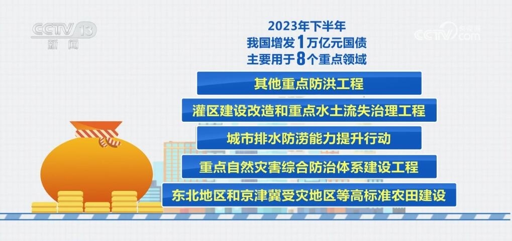 去年下半年,我國增發(fā)了1萬億元國債,主要用于8個重點領(lǐng)域,包括:災(zāi)后恢復(fù)重建,支持以京津冀為重點的華北地區(qū)等災(zāi)后恢復(fù)重建和提升防災(zāi)減災(zāi)能力,促進災(zāi)區(qū)基本生產(chǎn)生活條件和經(jīng)濟發(fā)展恢復(fù)到災(zāi)前的水平;以海河、松花江流域等北方地區(qū)為重點的骨干防洪治理工程;自然災(zāi)害應(yīng)急能力提升工程;其他重點防洪工程;灌區(qū)建設(shè)改造和重點水土流失治理工程;城市排水防澇能力提升行動;重點自然災(zāi)害綜合防治體系建設(shè)工程;東北地區(qū)和京津冀受災(zāi)地區(qū)等高標準農(nóng)田建設(shè)。