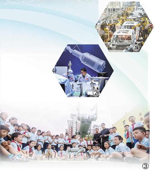 圖①:湖北武漢經(jīng)開區(qū)的嵐圖汽車電動化焊裝車間,機(jī)器人正在流水線上作業(yè)。 新華社記者 肖藝九攝 圖②:中國科學(xué)院空間光學(xué)系統(tǒng)在軌制造與集成重點(diǎn)實(shí)驗(yàn)室的科研人員在進(jìn)行科研工作。 新華社記者 許 暢攝 圖③:河北邯鄲市復(fù)興區(qū)前進(jìn)小學(xué)的學(xué)生們在觀看機(jī)器狗表演。聶長青攝(人民視覺)