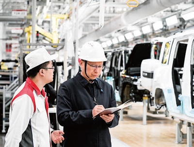 全國人大代表、重慶紅江機(jī)械有限責(zé)任公司加工中心特級技師傅國濤(右)在汽車智能化生產(chǎn)車間進(jìn)行調(diào)研。