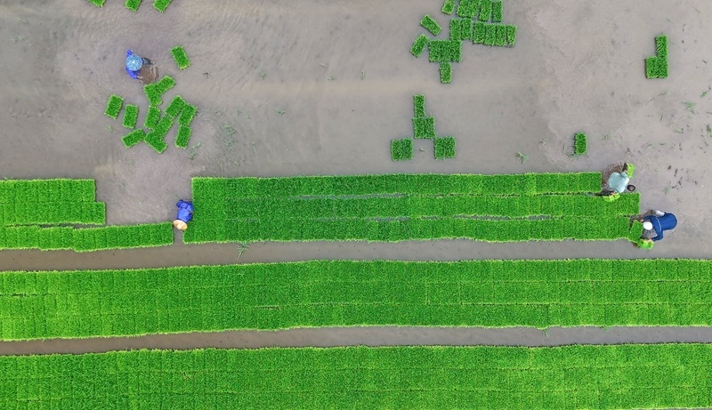 6月11日,在浙江省臺州市仙居縣雙廟鄉(xiāng),農(nóng)民在田間起運秧苗(無人機(jī)照片)。