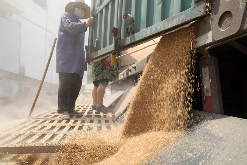 6月13日,河南省焦作市溫縣一家糧庫職工往倉庫儲(chǔ)運(yùn)夏糧。