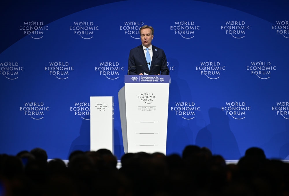 6月25日,世界經濟論壇總裁博爾格·布倫德在2025夏季達沃斯論壇開幕式上發(fā)言。新華社記者 孫凡越 攝
