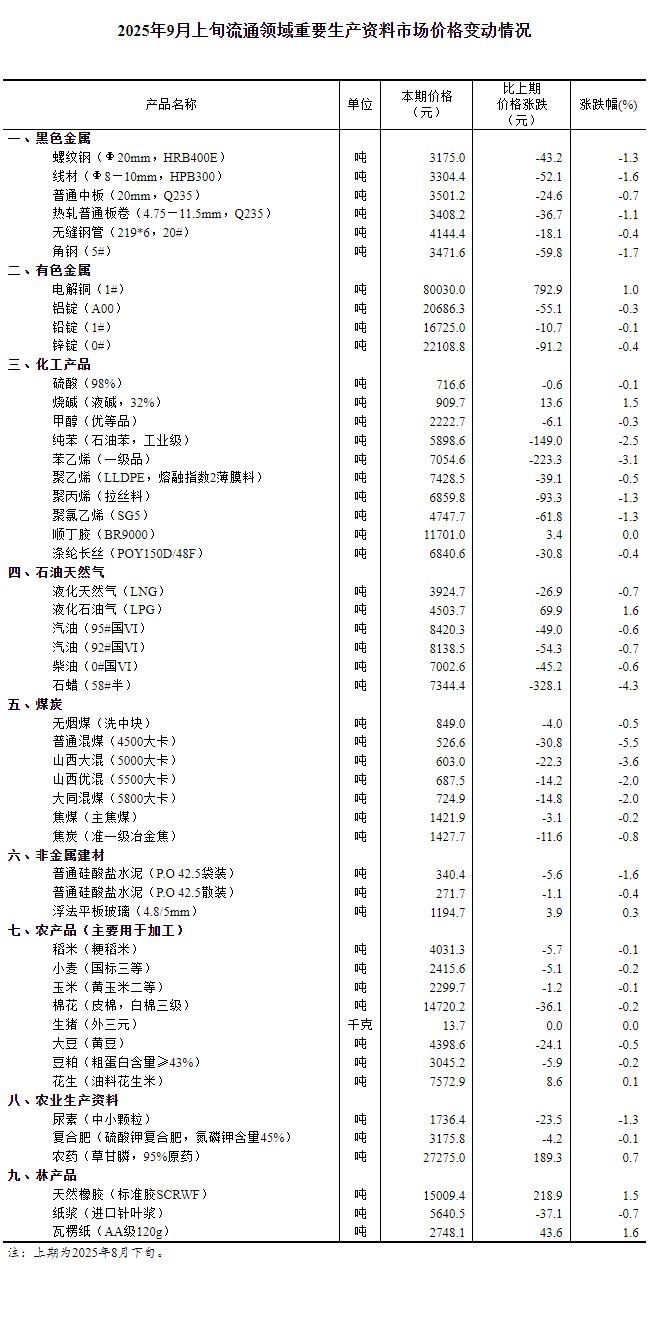 據(jù)國家統(tǒng)計局網(wǎng)站消息,國家統(tǒng)計局14日公布2025年9月上旬流通領(lǐng)域重要生產(chǎn)資料市場價格變動情況。