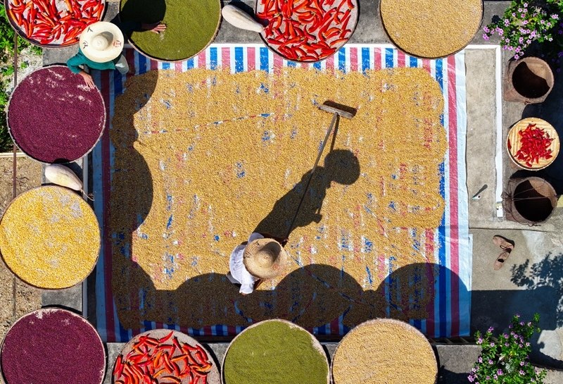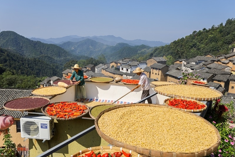秋收時節(jié),在安徽省黃山市歙縣深渡鎮(zhèn)陽產村,村民利用晴好天氣,抓緊晾曬收獲的辣椒、玉米、山核桃等農作物,描繪出一幅山村“曬秋”圖。