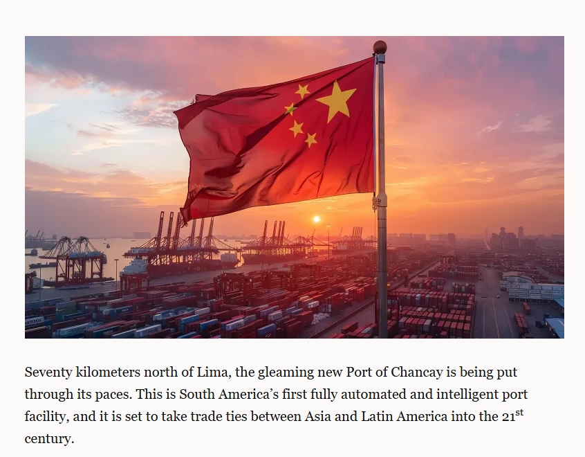 文章首先將目光投向在秘魯首都利馬以北70公里處的錢凱港。這個由中國和秘魯合作建設的嶄新港口,是南美洲首個全自動智能化港口設施,它將把亞洲與拉丁美洲的貿(mào)易關系帶入21世紀。隨著通往該港口的跨大陸公路和鐵路連接完工,錢凱港不僅要處理涉及南美洲太平洋沿岸的進出口貨物,也將處理從阿根廷、巴西和巴拉圭穿越太平洋運往中國的牛肉、大豆和小麥等貨物。