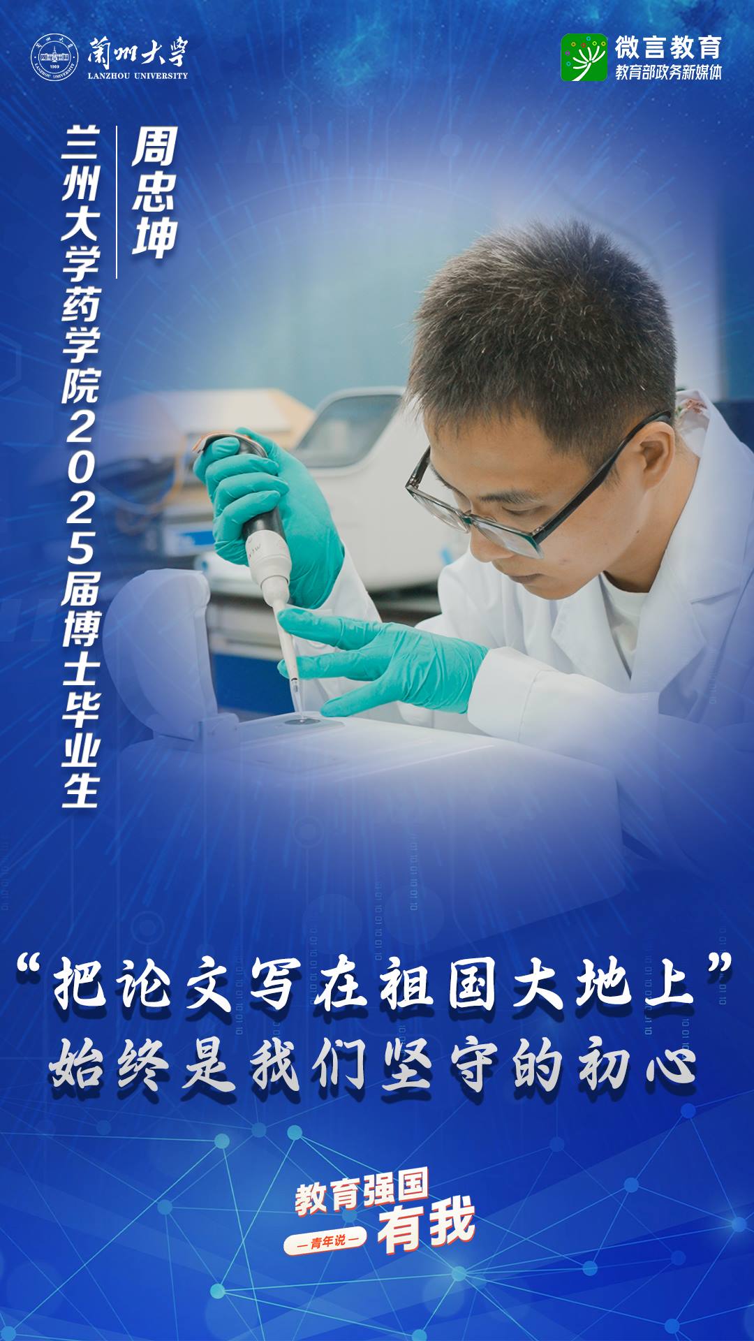 習(xí)近平總書記強(qiáng)調(diào),希望廣大青年堅(jiān)定理想信念,厚植家國(guó)情懷,練就過(guò)硬本領(lǐng),發(fā)揚(yáng)奮斗精神,到祖國(guó)和人民最需要的地方發(fā)光發(fā)熱,為中國(guó)式現(xiàn)代化建設(shè)貢獻(xiàn)青春力量。教育強(qiáng)國(guó)建設(shè),青年何為?教育部政務(wù)新媒體推出“教育強(qiáng)國(guó),有我!”網(wǎng)絡(luò)主題宣傳活動(dòng)之“青年說(shuō)(報(bào)國(guó)篇)”系列,展現(xiàn)青年學(xué)子將個(gè)人理想融入國(guó)家發(fā)展的青春擔(dān)當(dāng)。今天,跟教育小微通過(guò)1個(gè)視頻和1組海報(bào),一起來(lái)看蘭州大學(xué)學(xué)子如何把論文寫在祖國(guó)大地上——