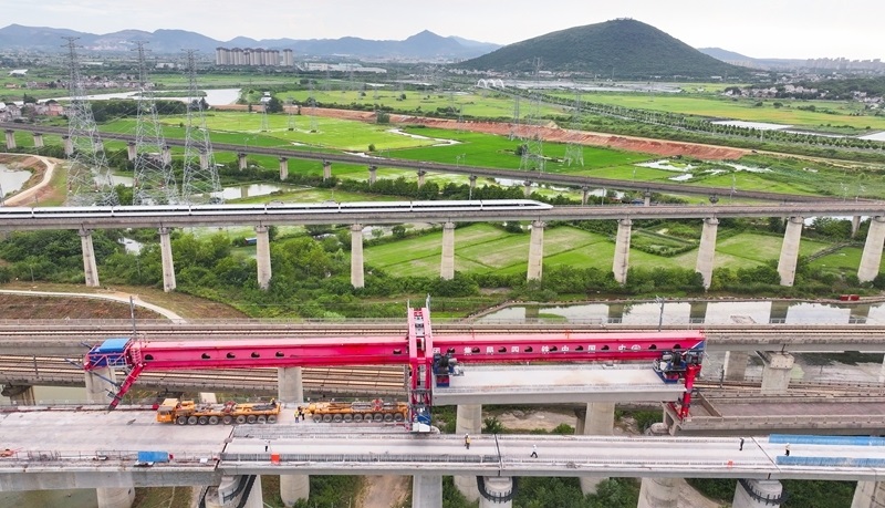 中鐵四局施工機(jī)械在巢馬城際鐵路最后一榀箱梁架設(shè)現(xiàn)場(chǎng)作業(yè)(7月8日攝,無(wú)人機(jī)照片)。