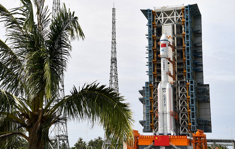 7月12日,天舟九號(hào)貨運(yùn)飛船與長(zhǎng)征七號(hào)遙十運(yùn)載火箭組合體垂直轉(zhuǎn)運(yùn)中。