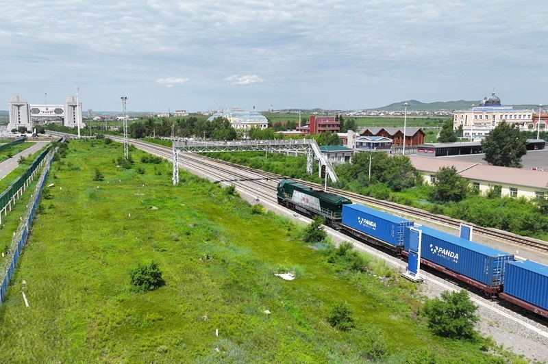 7月24日,一列滿載貨物的中歐班列從中國(guó)鐵路哈爾濱局集團(tuán)有限公司滿洲里站駛出國(guó)門(無人機(jī)照片)。