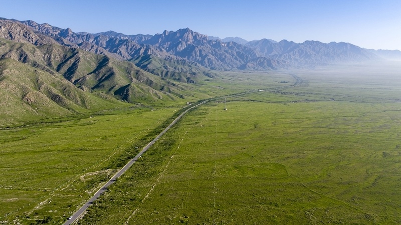 賀蘭山下的戈壁灘草木茂盛(7月29日攝,無(wú)人機(jī)照片)。