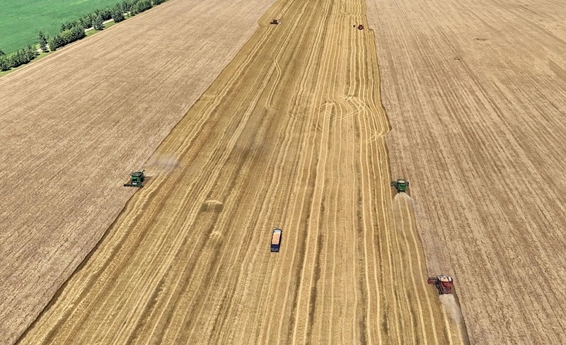 8月5日,位于黑龍江省五大連池市的大慶油田農(nóng)場(chǎng)調(diào)動(dòng)多臺(tái)聯(lián)合收割機(jī)搶收小麥(無(wú)人機(jī)照片)。