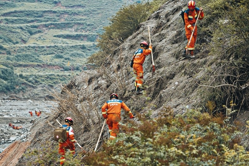 8月9日,國家西北區(qū)域應急救援中心指戰(zhàn)員在馬坡鄉(xiāng)舊莊溝村攜帶搜救犬配合大型機械搜救失聯(lián)人員。