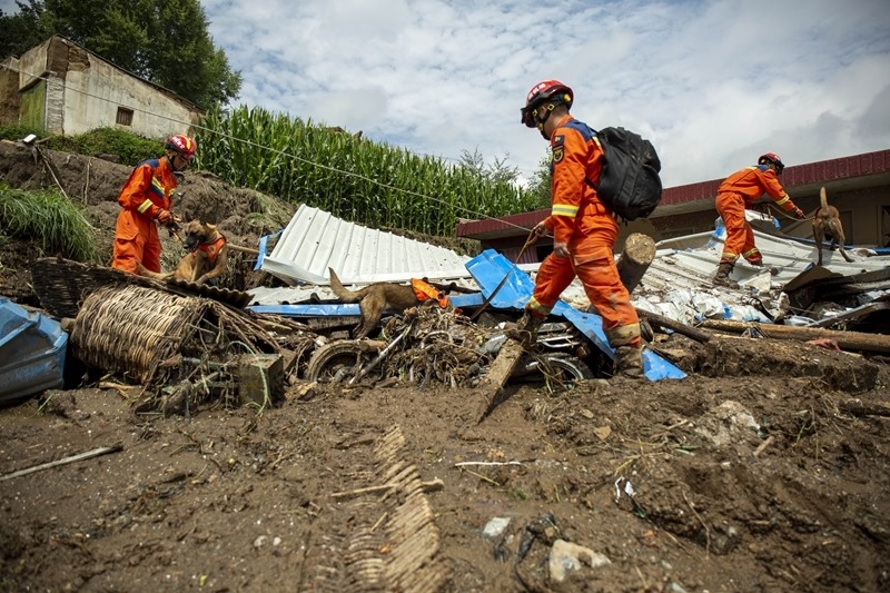 8月9日,國家西北區(qū)域應急救援中心指戰(zhàn)員在馬坡鄉(xiāng)舊莊溝村利用搜救犬搜救失聯(lián)人員。