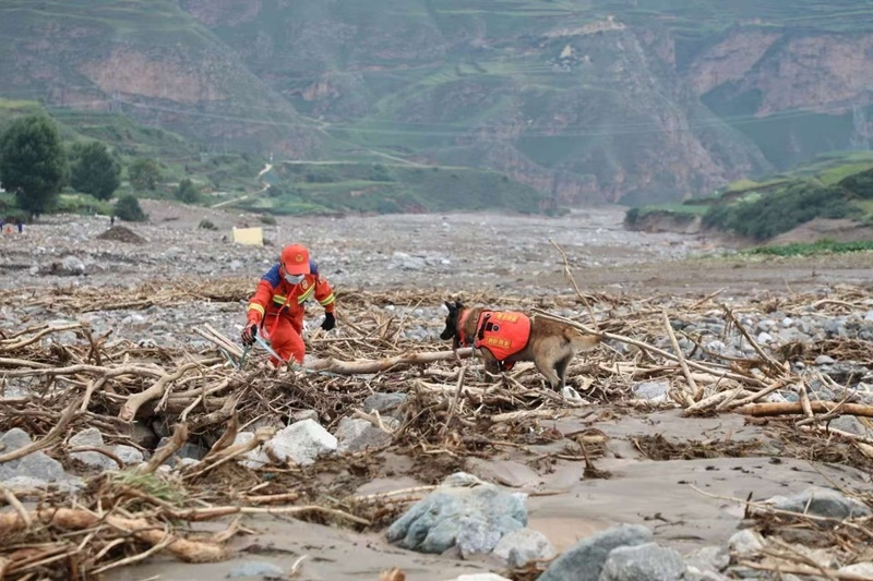 8月10日,在甘肅省榆中縣馬坡鄉(xiāng)馬蓮灘村,甘肅消防救援總隊(duì)指戰(zhàn)員攜帶搜救犬,利用專(zhuān)業(yè)裝備全力搜救失聯(lián)人員。