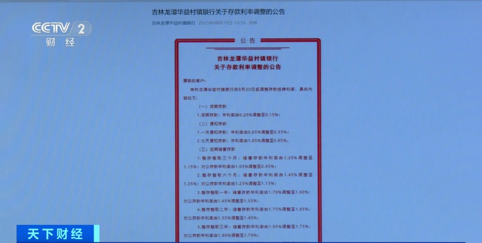 此外,吉林龍?zhí)度A益村鎮(zhèn)銀行自8月20日起調(diào)整存款利率,活期存款年利率由0.2%調(diào)整至0.15%,個(gè)人儲(chǔ)蓄定期存款3個(gè)月、6個(gè)月、1年期、2年期的年利率均下調(diào)10個(gè)基點(diǎn),3年期、5年期則下調(diào)20個(gè)基點(diǎn)。