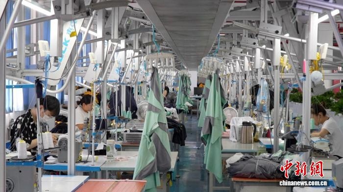 走進當?shù)匾患抑鳡I校服的服裝企業(yè),數(shù)字化吊掛系統(tǒng)賦能下,工廠流水線加速運轉,企業(yè)校服日產(chǎn)量可達2萬套。
