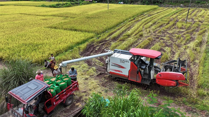8月30日,云南省勐臘縣勐侖鎮(zhèn)大卡村農(nóng)民運送剛收獲的水稻(無人機(jī)照片)。