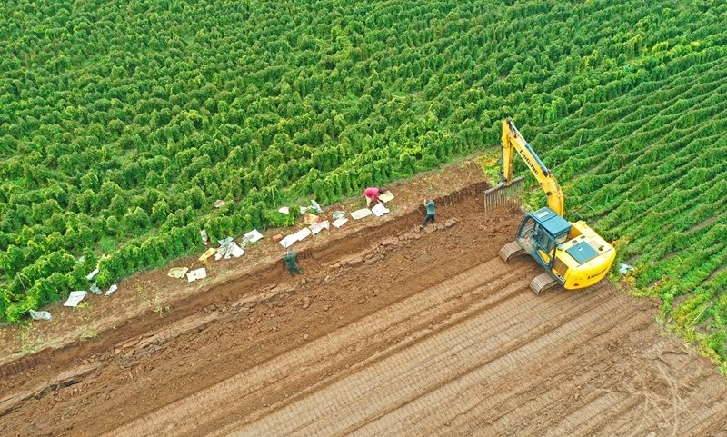 10月11日,河南省焦作市孟州市城伯鎮(zhèn)西后津村農(nóng)民在田間搶收鐵棍山藥(無人機(jī)照片)。