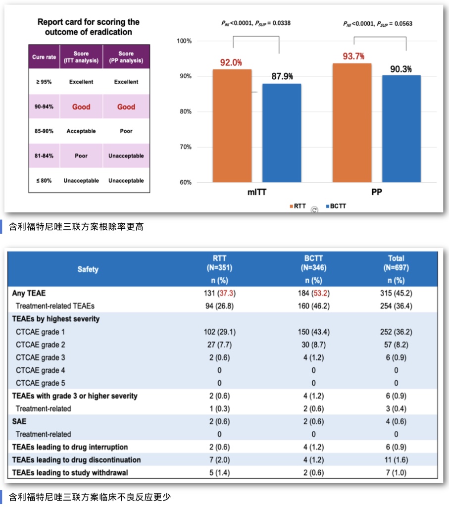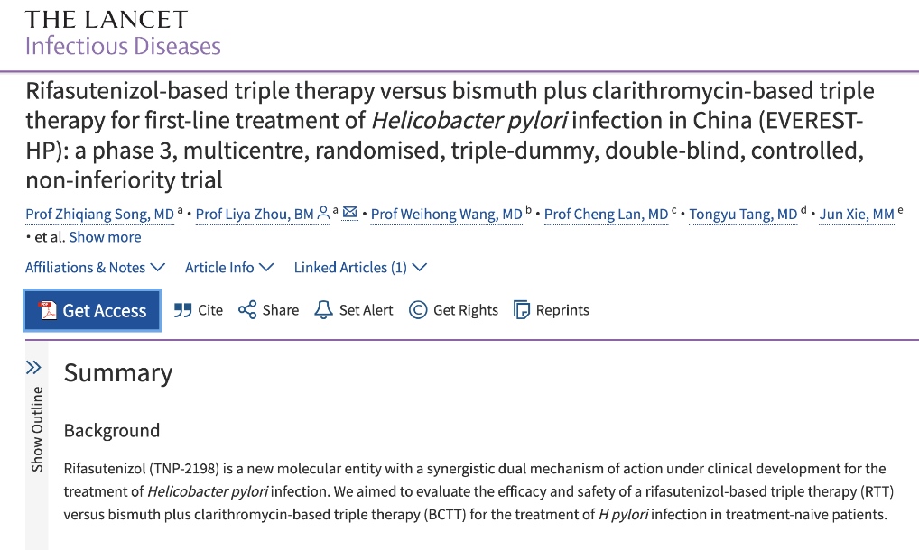 北京大學第三醫(yī)院消化科周麗雅、宋志強教授團隊帶領全國40家醫(yī)療機構消化疾病診療中心,通過全球首個Ⅲ期臨床試驗,證實了含利福特尼唑的三聯(lián)方案,比臨床上常用的鉍劑四聯(lián)方案具有更高的根除成功率和更低的不良反應發(fā)生率,而且用藥更少,服用更方便,將為全球幽門螺桿菌感染者帶來了全新的治療選擇。相關成果日前于《柳葉刀-感染病學》在線發(fā)表。