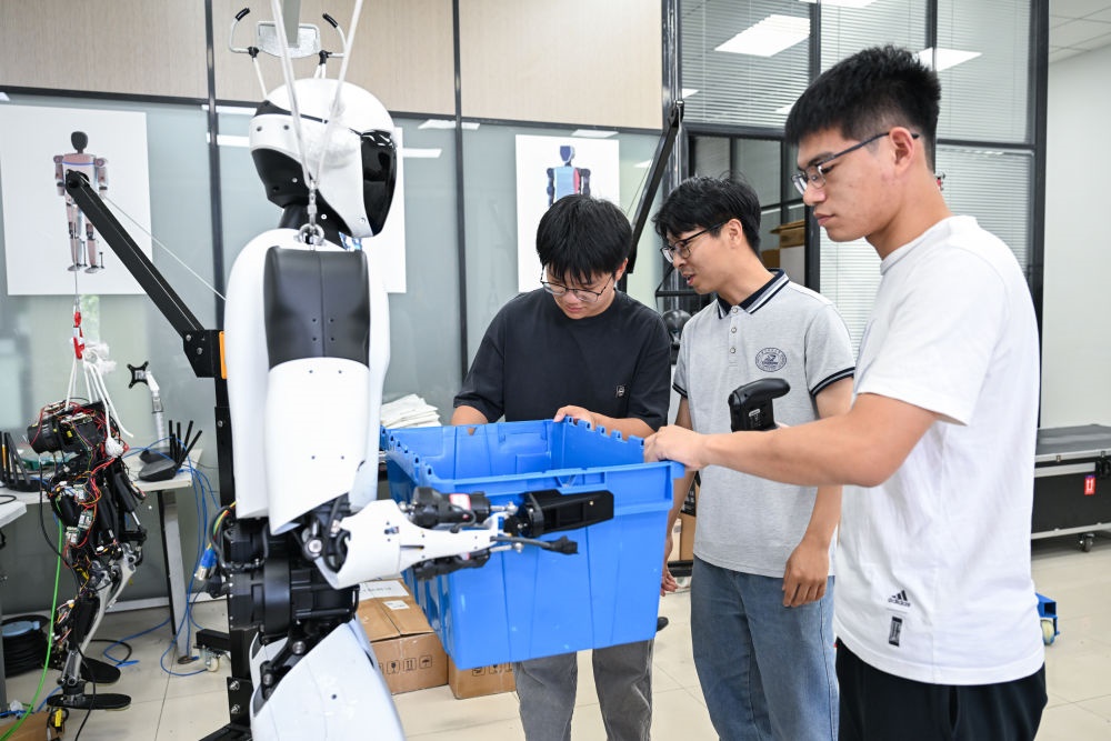 2025年5月29日,華中科技大學(xué)機(jī)械科學(xué)與工程學(xué)院,學(xué)生對(duì)“荊楚”人形機(jī)器人進(jìn)行搬運(yùn)測試。新華社記者 杜子璇 攝
