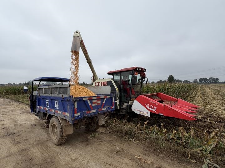 圖為一臺(tái)履帶式聯(lián)合收割機(jī)在陜西省武功縣長寧鎮(zhèn)一處糧田完成收割后將玉米倒入運(yùn)糧車。新華社記者劉彤 攝