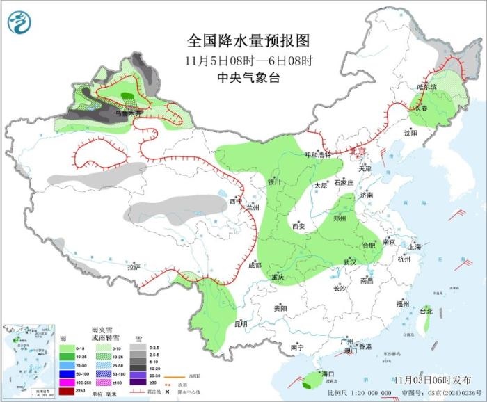 11月4日8時至5日8時,新疆西北部和南疆西部山區(qū)等地部分地區(qū)有小到中雪或雨夾雪,其中,新疆阿勒泰山區(qū)、沿天山地區(qū)西部等地部分地區(qū)大雪,局地暴雪(10~12毫米),新增積雪深度2~4厘米,局地6~10厘米。江南中南部、云南西部、華南、臺灣島等地部分地區(qū)有小到中雨,其中,海南島東部等地部分地區(qū)有大雨(25~40毫米)。南海東南部海域?qū)⒂?~10級、陣風(fēng)11級的風(fēng),東海北部海域?qū)⒂?~7級、陣風(fēng)8級的風(fēng)。