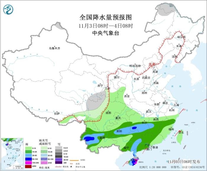 11月3日8時至4日8時,西藏東部、川西高原中北部等地部分地區(qū)有小到中雪或雨夾雪。江南中南部、西南地區(qū)南部、華南大部等地部分地區(qū)有中到大雨,其中,湖南西部、云南西部、海南島中東部等地部分地區(qū)有暴雨,海南島東北部局地有大暴雨(100~240毫米);內(nèi)蒙古中東部、東北地區(qū)有4~5級風(fēng),陣風(fēng)6~7級;臺灣海峽、巴士海峽將有6~8級、陣風(fēng)9級的風(fēng),東海南部海域、臺灣以東洋面、北部灣、瓊州海峽、南海北部和中東部海域?qū)⒂?~7級、陣風(fēng)8級的風(fēng)。