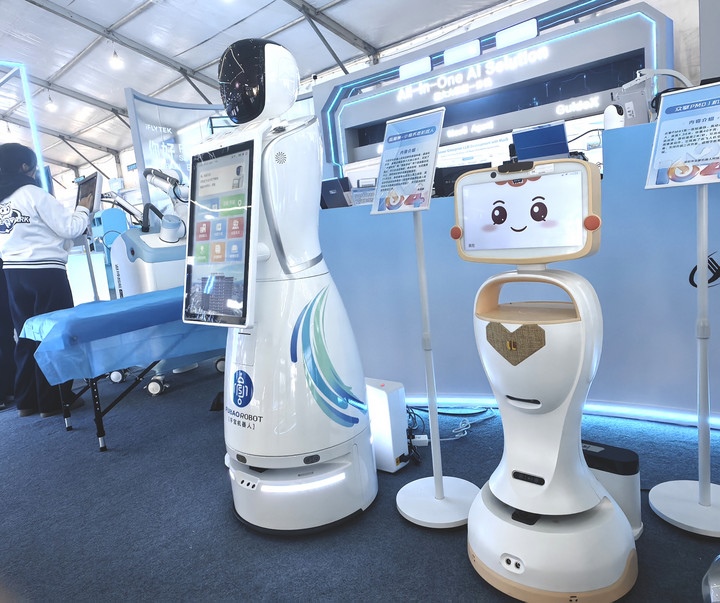 這是在第八屆世界聲博會(huì)上展出的長(zhǎng)者陪伴機(jī)器人(右)(11月3日攝)。新華社記者 汪海月 攝