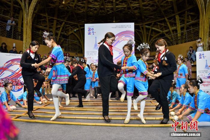 2024年10月27日,海南省五指山市,法國(guó)巴黎寶麗聲童聲合唱團(tuán)與海南五指山黎苗童聲合唱團(tuán)成員一起體驗(yàn)竹竿舞。中新社記者 駱云飛 攝