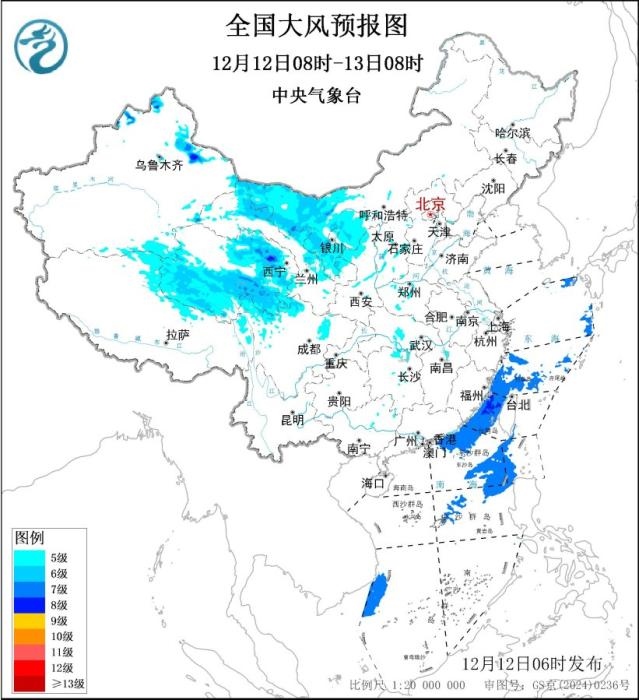 此外,12月12日08時(shí)至13日08時(shí),新疆北部、青海、西藏北部、內(nèi)蒙古西部、四川北部、甘肅東部、寧夏、陜西西北部等地部分地區(qū)有5~7級、陣風(fēng)8~9級的大風(fēng),其中,新疆山口地區(qū)陣風(fēng)可達(dá)10~11級;東海南部部分海域、臺灣海峽、巴士海峽、南海東北部和中東部部分海域?qū)⒂?級、陣風(fēng)8~9級的大風(fēng)。中央氣象臺12月12日06時(shí)繼續(xù)發(fā)布大風(fēng)藍(lán)色預(yù)警。