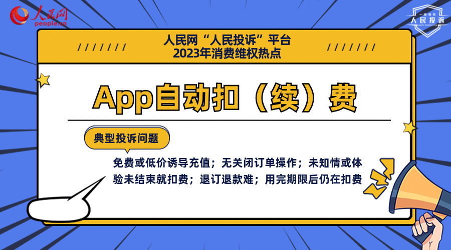 2023年以來,“人民投訴”上,被投訴的App類別涉及工具類、休閑娛樂類、閱讀學(xué)習(xí)類、通信平臺類、生活服務(wù)類、游戲類、出行服務(wù)類等多個領(lǐng)域?!拔词盏教崾?,被直接扣除一年超級會員費”“購買了一年圖片使用權(quán),無按鈕或通道取消自動扣費服務(wù)”“點擊免費試用卻被惡意扣費,平臺不退費”“7天體驗期未到,提前12小時自動扣費”“購買1年會員并充值成功,商家以充值成功為由擅自開通自動扣費季度會員”“以1元試用默認(rèn)開通自動續(xù)費服務(wù),扣費達(dá)20月”“購買包月會員時,沒有別的選項可以選擇,都帶著自動續(xù)費”“免費七天VIP,在第六天就被取消了”“已經(jīng)卸載幾個月了,還在扣錢”等侵權(quán)行為令網(wǎng)友困擾不已。