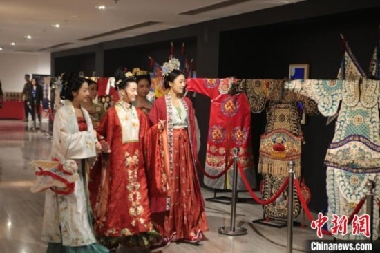 9月28日晚,第十四屆中華世紀(jì)壇中秋詩會(huì)在京舉行,圖為民眾身著漢服參觀京劇服裝。 主辦方供圖