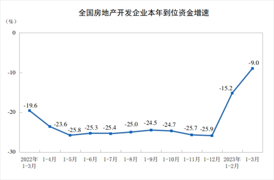 1—3月份,房地產(chǎn)開發(fā)企業(yè)到位資金34708億元,同比下降9.0%。其中,國(guó)內(nèi)貸款4995億元,下降9.6%;利用外資8億元,下降22.7%;自籌資金10171億元,下降17.9%;定金及預(yù)收款11909億元,下降2.8%;個(gè)人按揭貸款6188億元,下降2.9%。