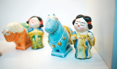 如今,唐三彩中常見的馬、駱駝等造型,形態(tài)更多元,顏色也更豐富。在洛陽“鎮(zhèn)搗蛋”等文創(chuàng)店,憨態(tài)可掬的三彩小馬除了傳統(tǒng)配色,還有粉色、水藍色等符合年輕人審美的莫蘭迪色系。三彩小馬、三彩侍女俑的文創(chuàng)組合,成為不少游客的到店選擇。