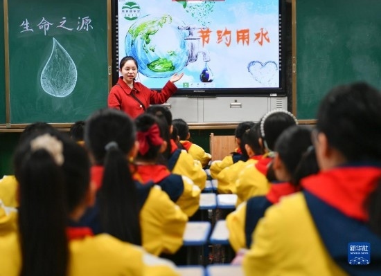 3月22日,在四川省廣安市前鋒區(qū)前鋒小學(xué),老師在講解節(jié)水護(hù)水知識。