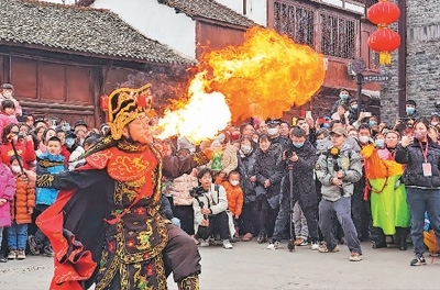 陜西省漢中市城固縣在上元觀古鎮(zhèn)開(kāi)展民俗傳統(tǒng)節(jié)目展演,吸引眾多游客觀賞。劉曉東攝(人民視覺(jué))