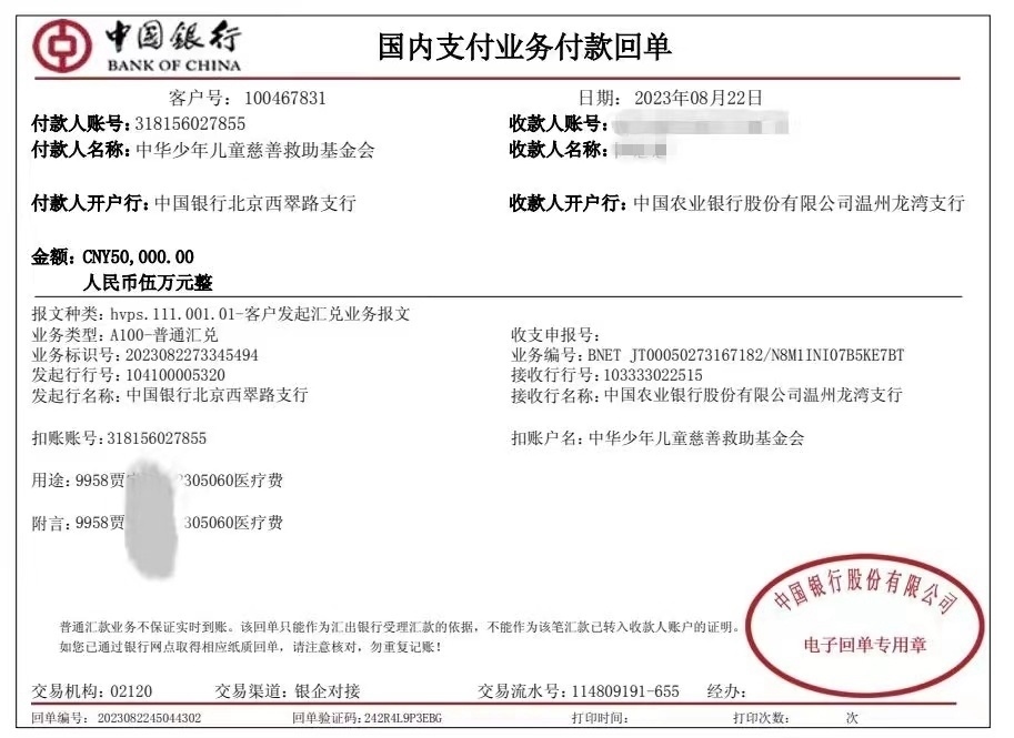 一位患者家屬提供給記者的銀行轉(zhuǎn)賬記錄顯示,8月22日的一張銀行的付款回單上,付款人名稱為:中華少年兒童慈善救助基金會,收款人名稱為患者家屬陳某某,單據(jù)上標注的用途為某某某醫(yī)藥費等字樣。收款金額為5萬元。