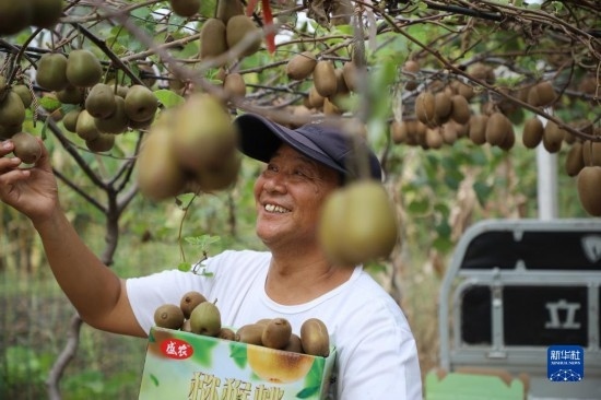 9月14日,農(nóng)民在河南省駐馬店市驛城區(qū)諸市鎮(zhèn)石莊村獼猴桃種植園采摘獼猴桃。