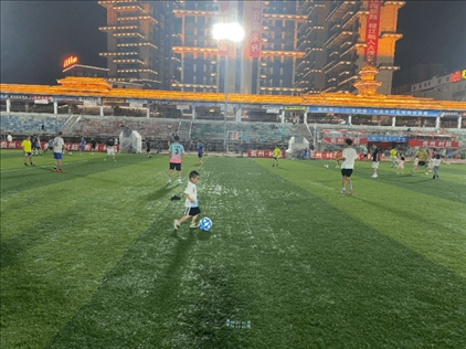 在比賽間隙和結(jié)束后,觀眾席上的孩子們會沖進球場,玩起傳球、盤帶和射門;工作日的晚上,“村超”體育場上,有很多踢球的身影,有中學足球隊的隊員,有八九歲的小學生,還有剛剛學會走路的小朋友。
