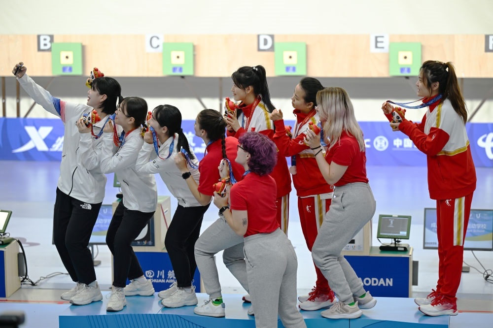 7月29日,大運(yùn)會射擊女子10米氣步槍團(tuán)體前三名選手在頒獎儀式上合影。新華社記者 劉坤 攝