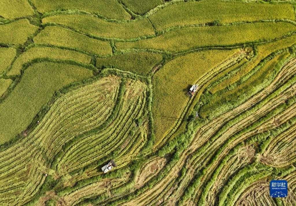 近日,四川東部廣安市近200萬(wàn)畝水稻進(jìn)入成熟收獲期,農(nóng)民在田間忙碌,收獲水稻。