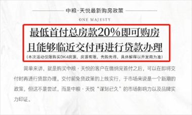 8月26日,紅星資本局向“中糧天悅”售樓部求證此時(shí),一名置業(yè)顧問(wèn)回復(fù)稱(chēng),最近確實(shí)推出了“先交付后還貸”的購(gòu)房政策,購(gòu)房者可以先交首付,簽訂購(gòu)房合同,交房前再辦理貸款即可。