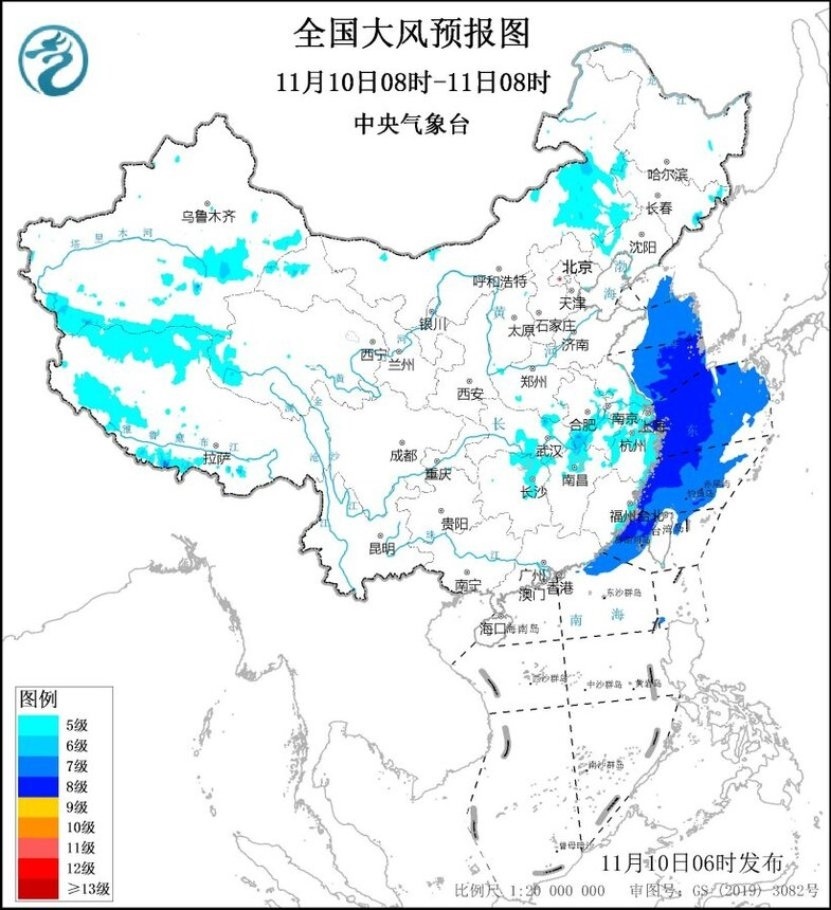 11月10日08時至11日08時,內(nèi)蒙古中東部、遼寧西部、安徽中南部、河南南部、江蘇南部、上海、湖北南部、湖南東北部、江西北部、浙江北部及東部沿海、福建沿海、臺灣島沿海等地有5~6級、陣風(fēng)7~8級的大風(fēng);黃海大部海域、東海大部海域、臺灣海峽、臺灣以東洋面偏北海域、南海東北部偏北海域?qū)⒂?~8級、陣風(fēng)9~10級的大風(fēng)。11月11日08時至12日08時,安徽南部、湖北中東部、湖南大部、江西中北部、廣西東北部以及福建沿海、廣東東部沿海、臺灣島沿海等地有5~6級、陣風(fēng)7~8級的大風(fēng);東海大部海域、臺灣海峽、臺灣以東洋面、南海北部海域、巴士海峽偏北海域?qū)⒂?~8級、陣風(fēng)9~10級的大風(fēng)。中央氣象臺11月10日06時繼續(xù)發(fā)布大風(fēng)藍(lán)色預(yù)警(見圖2、3)。