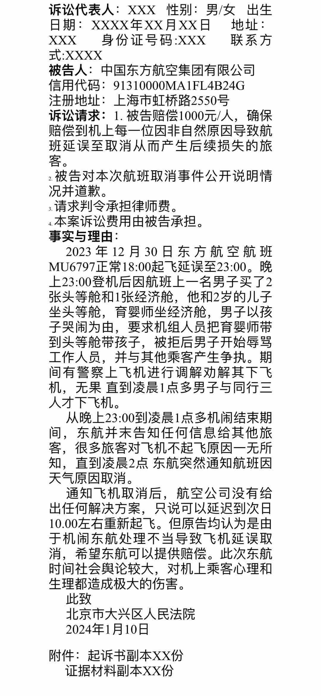 群內(nèi)發(fā)出的起訴書寫道:“從當日23點到次日凌晨1點多機鬧結(jié)束期間,東航并未告知任何信息給其他旅客,很多旅客對飛機不起飛原因一無所知,直到凌晨2點,東航突然通知航班因天氣原因取消。通知飛機取消后,航空公司沒有給出任何解決方案,只說可以延遲到次日10點左右重新起飛。但原告均認為是由于機鬧,東航處理不當,導致飛機延誤取消,希望東航可以提供賠償。此次東航事件社會輿論較大,對機上乘客心理和生理都造成極大的傷害。”據(jù)悉,乘客們擬起訴至北京市大興區(qū)人民法院。