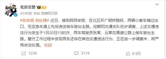·網(wǎng)民舉報(bào)“北五環(huán)廣順橋路段兩車在高速公路上倒車”,北京交警通報(bào)。
