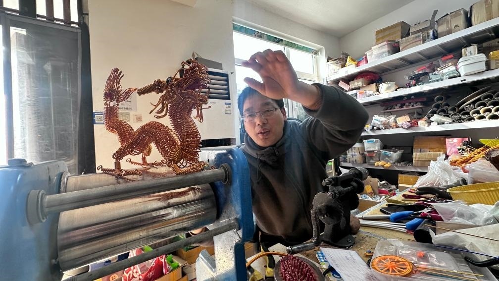 在村民楊訓政不大的鋁編工作室內(nèi),簡易貨架上一排排銅色鋁線編制成的藝術(shù)品讓人目不暇接。一條條鋁制彈簧經(jīng)過村民巧妙處理后,成了工藝品市場的搶手貨:發(fā)財樹、恐龍、摩托車、機器人……“我這鋁編雖然產(chǎn)量低、規(guī)模小,訂單可已經(jīng)排到了今年10月底。龍年將至,來自海內(nèi)外的訂單讓大家年前忙得不亦樂乎?!睏钣栒贿呌勉Q子擺弄著鋁編小龍,一邊告訴記者。